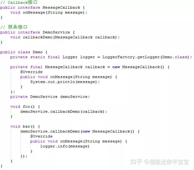 这段代码里有一个 DemoService 。其中的 callbackDemo 方法的参数是一个接口。下面的 Demo 类中分别在 foo 和 bar 两个方法中调用了这个 callbackDemo 方法。相信用过 Callback 的朋友们应该知道,foo 这个方法的调用方式是正确的,而 bar 这个方法在重复调用的时候是会报错的。因为对于同一个 Callback 接口,客户端只能创建一个实例。