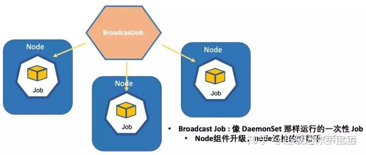 - BroadcastJob:在集群中的所有节点上运行 Pod 以完成的作业。