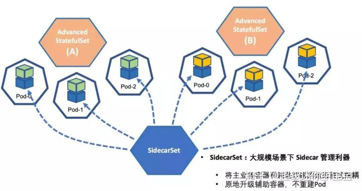 - SidecarSet:一个控制器,它根据选择器将边车容器注入 Pod 规范,并且能够升级边车容器。