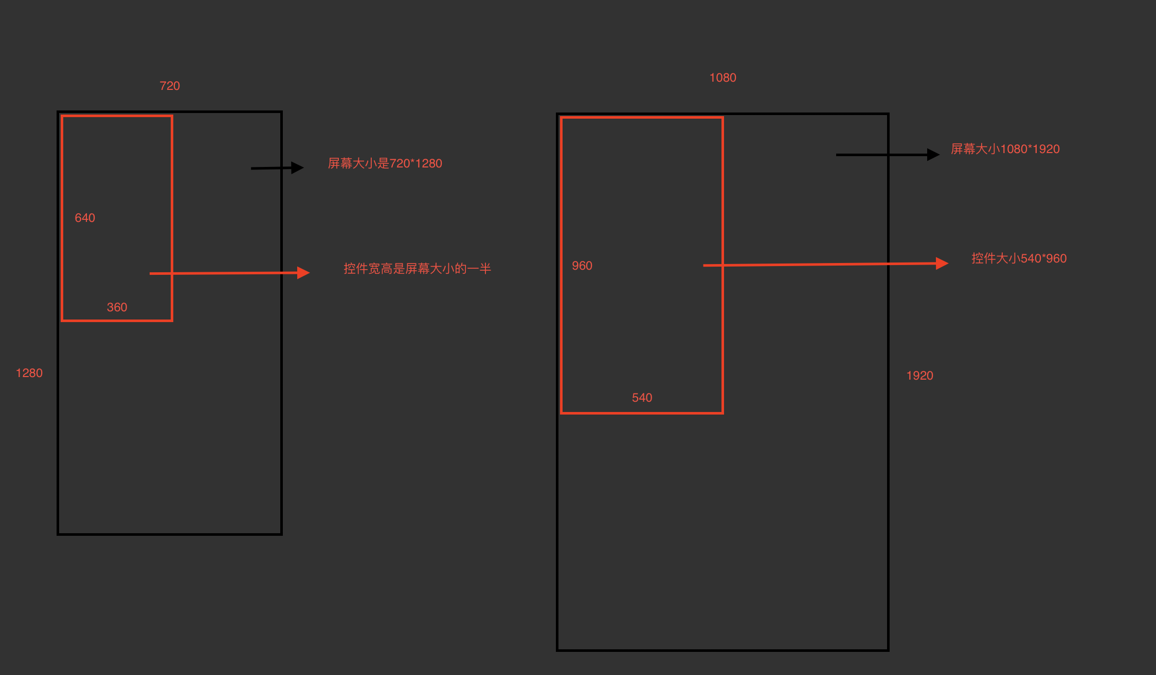 比如现在有个控件,宽高各是屏幕的一半,假设我们的屏幕是720p(720*1280)的屏幕,那这个控件的宽和高就应该是 360 * 640,如下图所示: