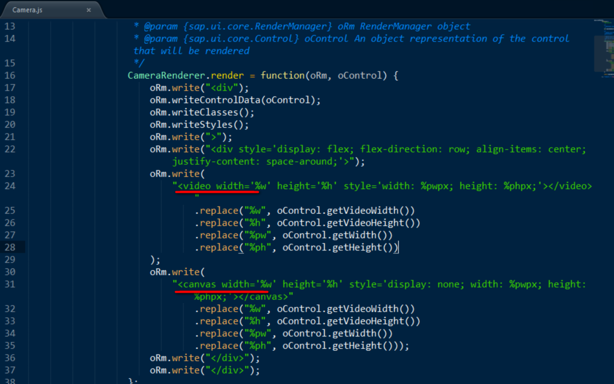 负责将这个自定义控件在XML视图里的标签"Camera"渲染成原生的video和canvas标签的组合。 SAP UI5的每一个控件都有一个与之对应的渲染类,用于完成XML视图里UI5的标签到HTML5原生标签的转换: