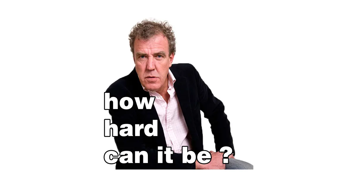这里我送大家一句话:“How hard can it be?” 直译过来就是“这能难到哪里去呢?” 这句话来自我最喜欢的前著名汽车评测节目“Top Gear”主持人,“大猩猩” Jeremy Clarkson。