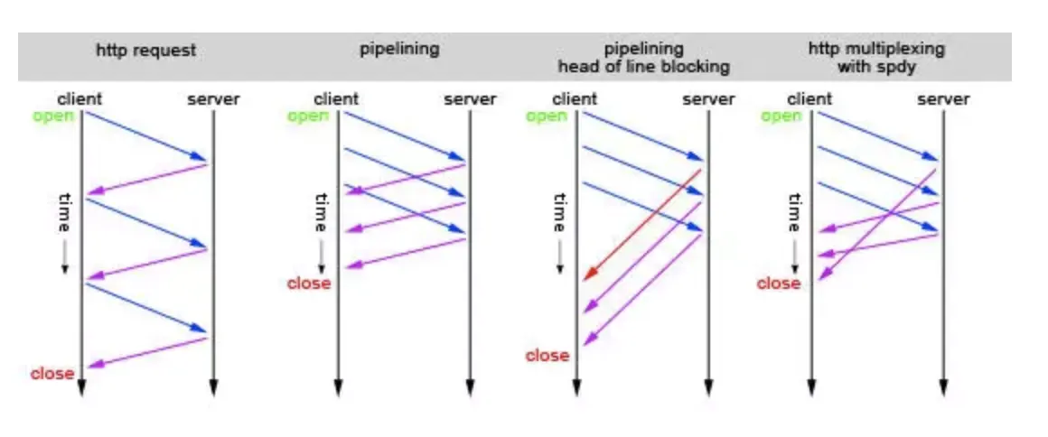 - 然而pipelining在接收response返回时,也必须依顺序接收,如果前一个请求遇到了阻塞,后面的请求即使已经处理完毕了,仍然需要等待阻塞的请求处理完毕。这种情况就如图中第三种,第一个请求阻塞后,后面的请求都需要等待,这也就是队头阻塞(Head of line blocking)。