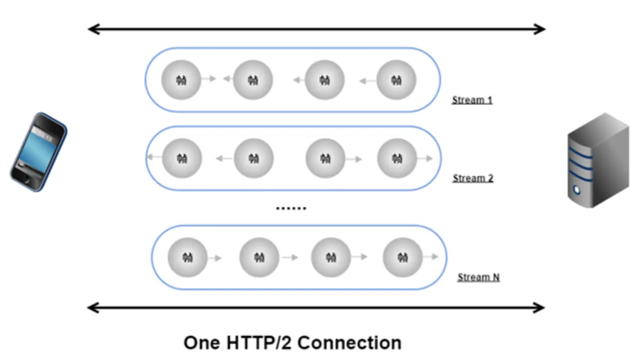 - 为了解决上述阻塞问题,http2中提出了多路复用(Multiplexing)技术,Multiplexing是通信和计算机网络领域的专业名词。http2中将多个请求复用同一个tcp链接中,将一个TCP连接分为若干个流(Stream),每个流中可以传输若干消息(Message),每个消息由若干最小的二进制帧(Frame)组成。也就是将每个request-response拆分为了细小的二进制帧Frame,这样即使一个请求被阻塞了,也不会影响其他请求,如图中第四种情况所示。