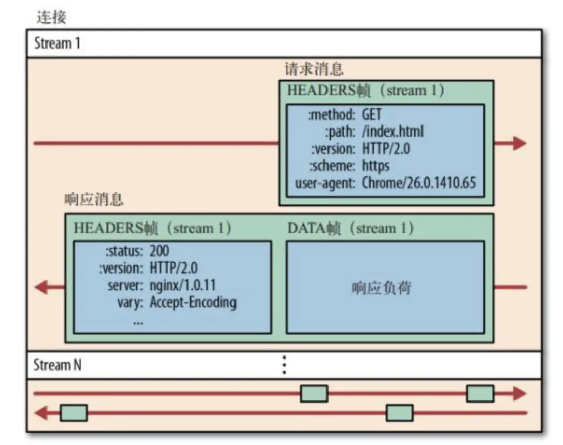 HTTP 消息泛指 HTTP 请求或响应。 流是用来传输一对请求 / 响 应消息的。一个消息至少由 HEADERS 帧(它初始化流)组成,并且可以另外包含 CONTINUATION 和 DATA 帧,以及其他的 HEADERS 帧。