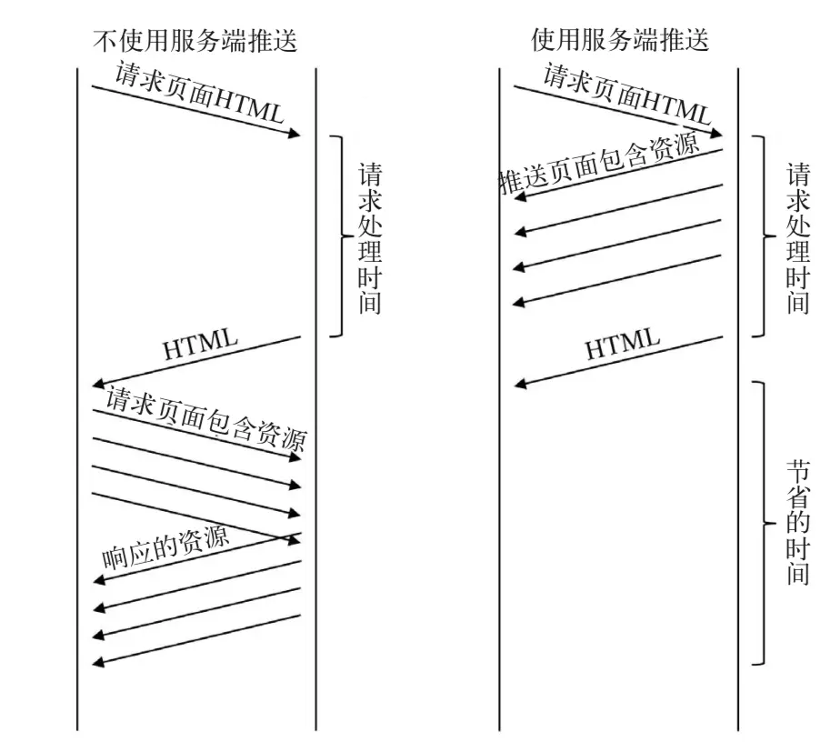 如果用户第一次访问页面时,就能向客户端推送页面渲染所需的关键 CSS 和 JS 资源,那 么服务端推送的真正价值就实现了。不过,这要求服务器端实现足够智能,以避免“推送 承诺”(push promise)与主体 HTML 页面传输竞争带宽。