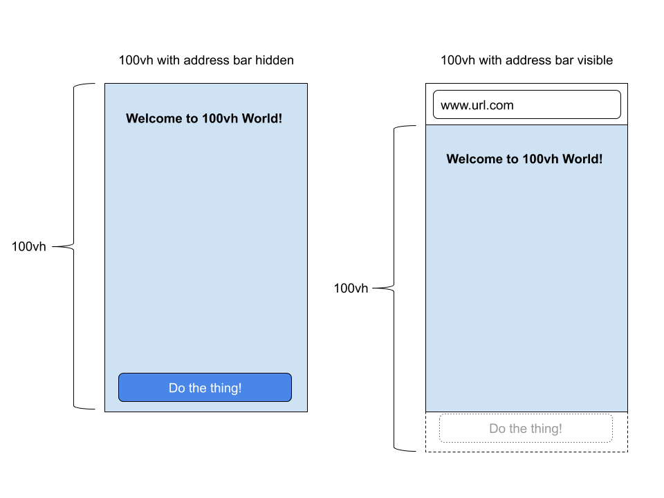 CSS中的视口单位听起来很棒。 如果要设置元素的样式以占据整个屏幕的高度,则可以设置height: 100vh,您拥有一个完美的全屏元素,该元素会随着视口的变化而调整大小! 可悲的是,事实并非如此。 100vh在移动浏览器中以微妙但基本的方式被破坏,这使其几乎无用。 最好避免100vh ,而是依靠javascript设置高度以获得完整的视口体验。