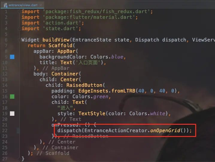 我们打开 /entrance/view.dart,为 RaisedButton 写点击事件 onPress。在这里dispatch我们定义的OpenGrid事件。