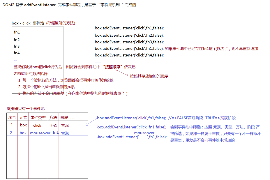 2、当我们基于鼠标或者键盘等操作的时候,浏览器会把本次操作的信息存储起来(标准浏览器存储到默认的内存中(自己找不到),IE低版本存储到window.event中了),存储的值是一个对象(堆内存);操作肯定会触发元素的某个行为,也就会把绑定的方法执行,此时标准浏览器会把之前存储的对象(准确来说是堆内存地址),当做实参传递给每一个执行的方法,所以操作一次,即使再多方法中都有EV,但是存储的值都是一个(本次操作信息的对象而已)