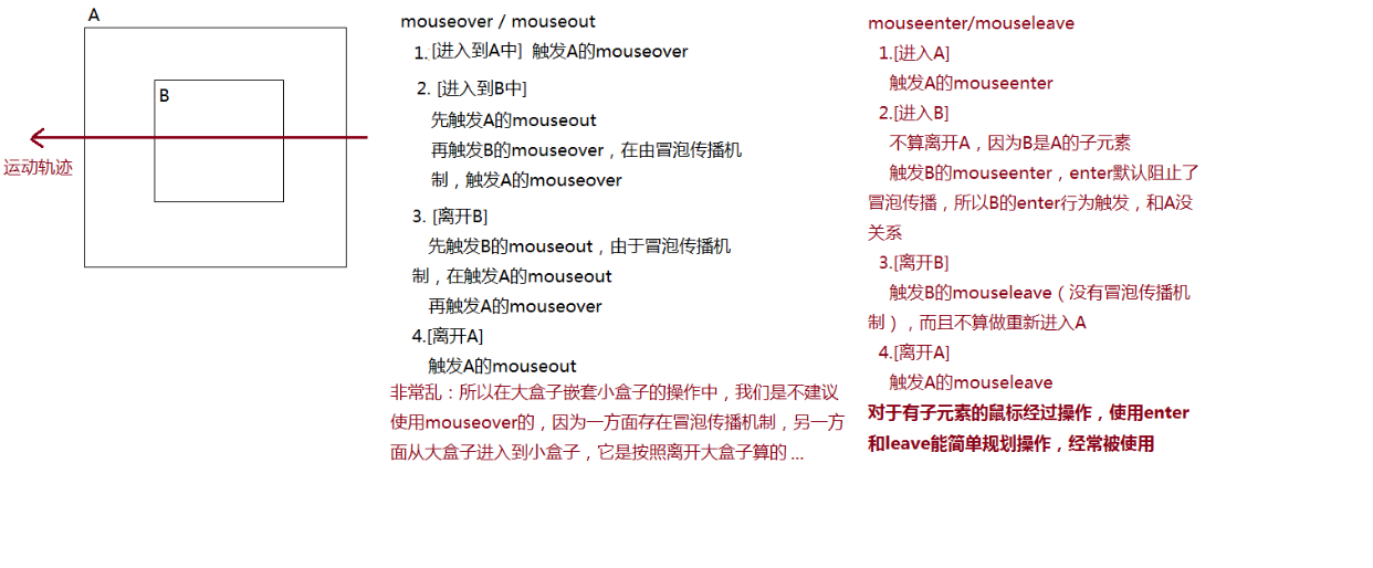3、enter和leave阻止了事件的冒泡传播,而over和out还存在冒泡传播的,所以对于父元素嵌套子元素这种情况,使用over会发生很多不愿意操作的事情,此时我们使用enter会更加简单,操作方便,所以真实项目中enter的使用会比over多