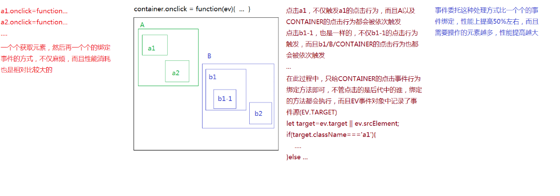 利用事件的冒泡传播机制,如果容器的后代元素中,很多元素的点击行为(其它事件行为也是)都要做一些处理,此时我们不需要再像以前那样一个一个获取一个一个的绑定了,我们只需要给容器的click绑定方法即可,这样不管点击的是哪个后代元素,都会根据冒泡传播的传递机制,把容器的click行为触发,把对应的方法执行,根据事件源,我们可以知道点击的是谁,从而做不同的事情