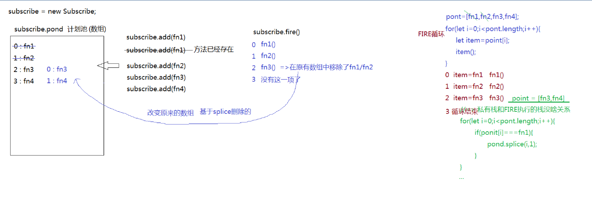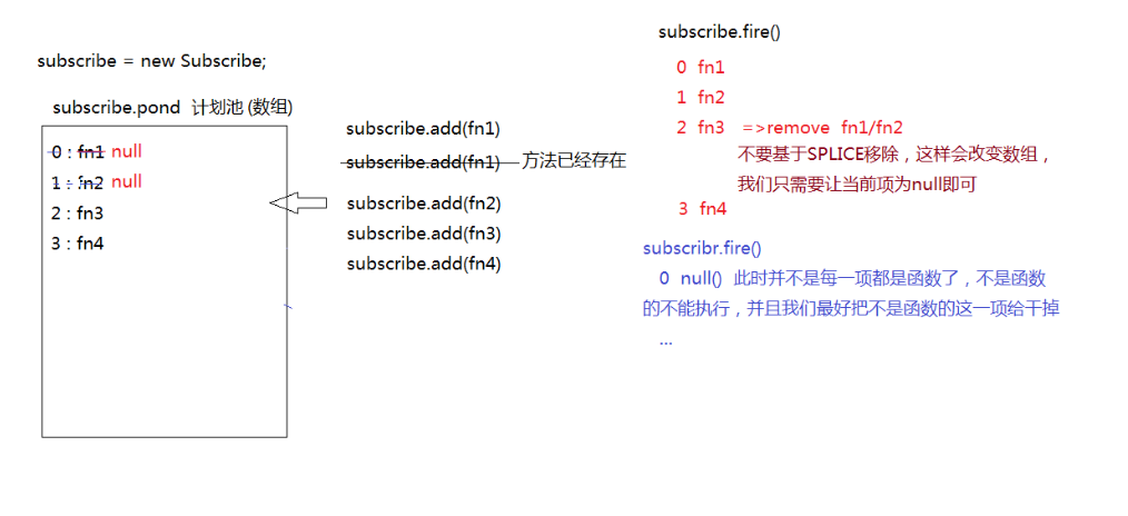 item===fn?pond[i]=null:null;//=>移除的时候赋值为null而不是直接删除掉,因为如果执行容器的时候,假如同时操作了remove函数,那会导致数组的索引发生改变