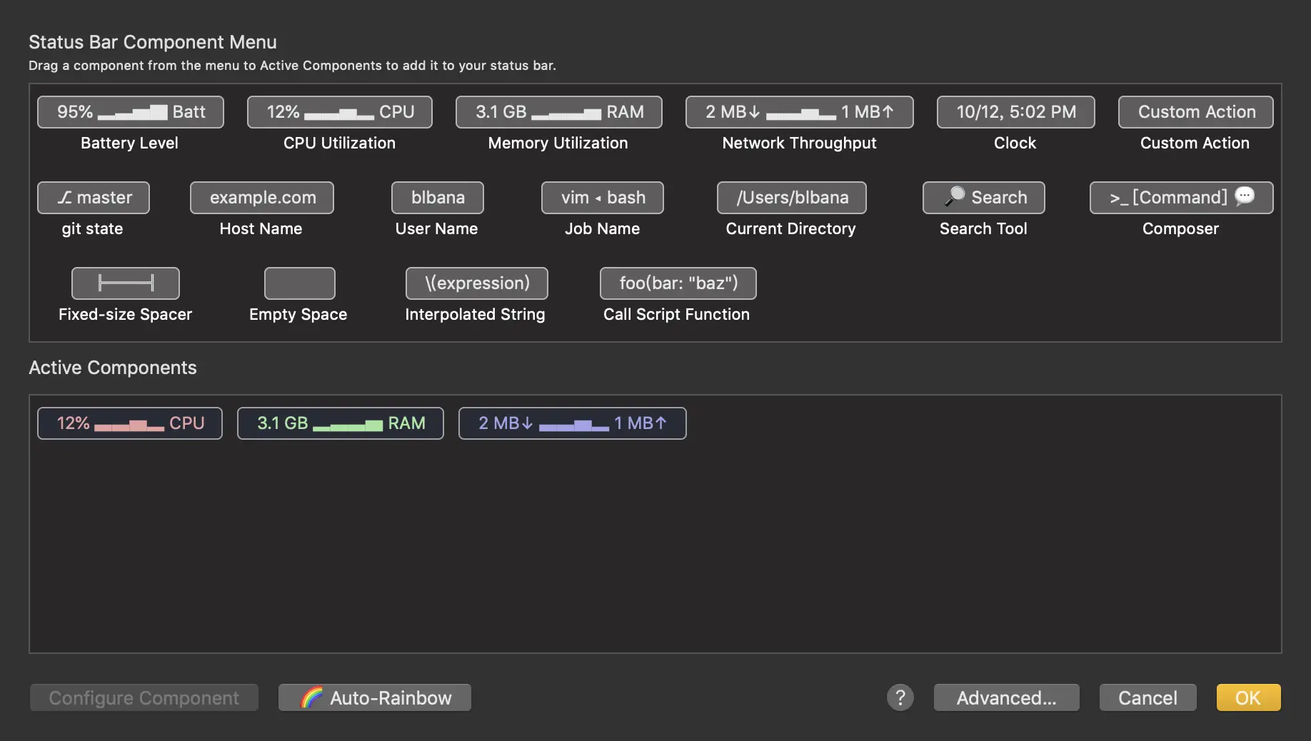 接下来就是个高逼格的东西了,配置终端的状态栏。可以拉取电量信息,CPU使用率,内存使用率,网络监控,时钟等功能,真乃是装逼利器。
