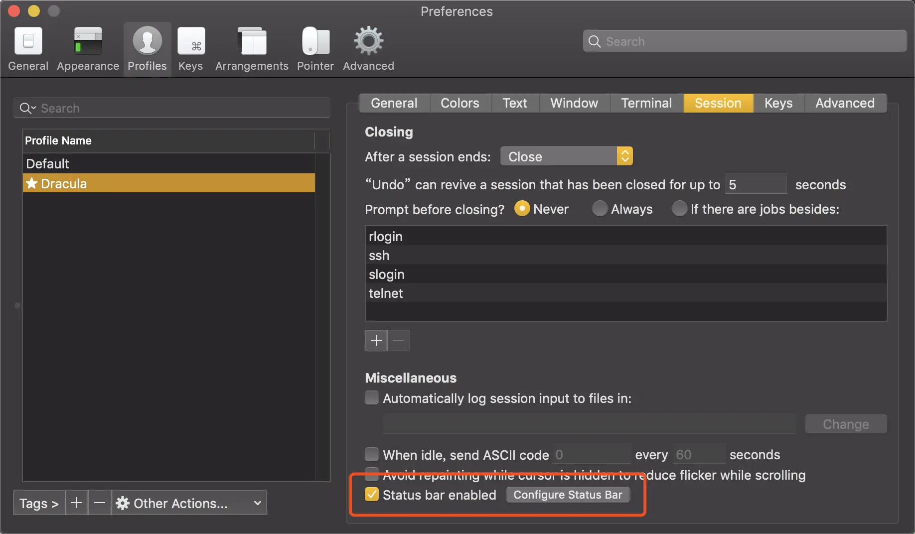 解压后导入配置到iTerm2中,红框处选择import导入配置文件Dracula.itermcolors。选择Dracula更换配色。