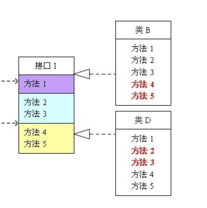 如上图所示类B只需要方法4和方法5两个功能,类D只需要方法2,方法3两个功能,但由于接口颗粒度比较多,导致类B不能不现实方法1,方法2,方法3 三个无用的功能,类D不能不现实方法1,方法4,方法5 三个无用的功能