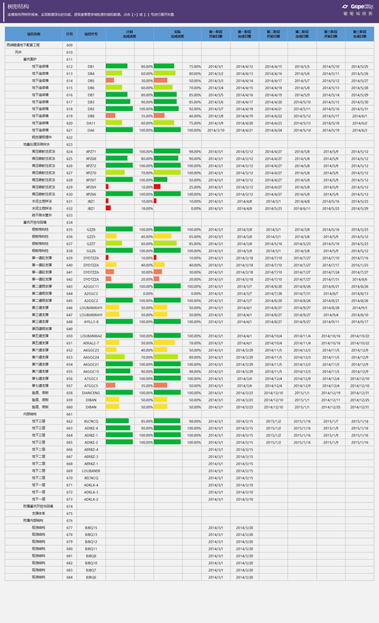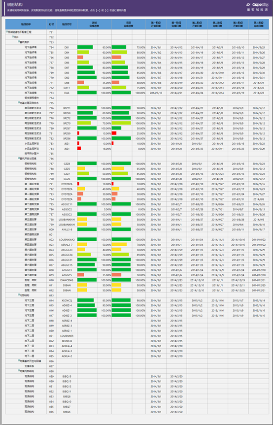 在一些统计报表中,利用树形结构报表来实现维度钻取功能是十分常见的。通过逐级钻取,可以快速查看更细粒度的指标数据,如项目施工进度报告等。