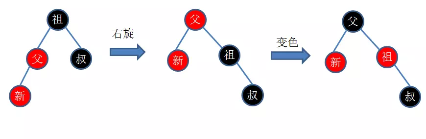 * 红父二黑侄:将父节点变成黑色,兄弟节点变成红色,新节点变成黑色即可,如下图所示