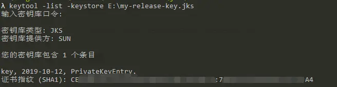 keytool -list -keystore E:\my-release-key.jks