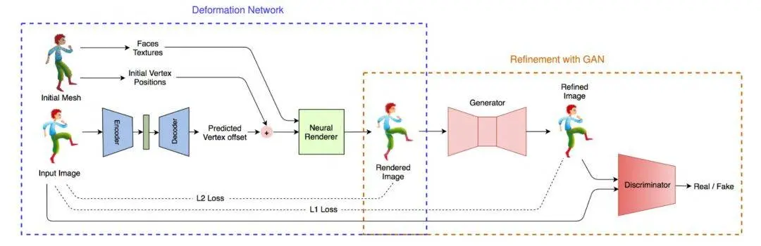 图 2:训练架构。编码器-解码器网络学习网格变形,条件生成对抗网络改进渲染图像,以捕捉纹理变化。