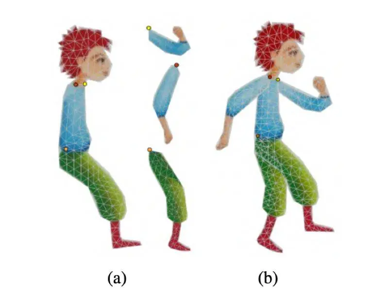 图 1:变形木偶。a)为每一个身体部位创建单独的网格,并标记关节(见图中圆圈);b)将这些网格连接起来,最终网格的 UV 图像包括分割纹理图的平移版本。