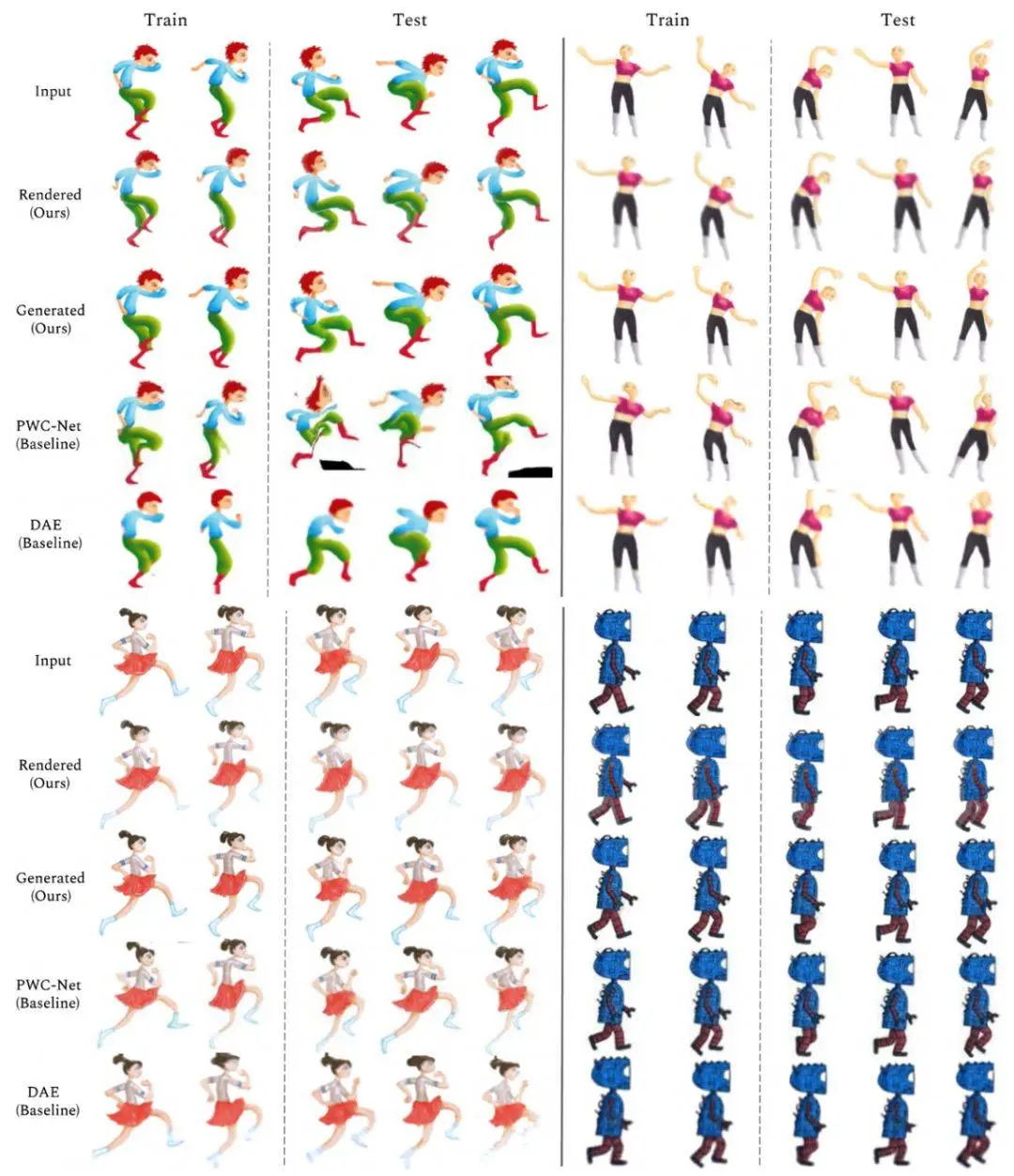人类在观察多个动作序列后,很容易想象出这个角色在做其他姿势时的细节样貌,但这对于算法而言没那么容易:关节接合、艺术效果和视角变化等都会对图像外观产生大量细微差别,这些极大增加了提取底层角色结构的复杂度。人类的自然图像尚且可以依赖大量标注或数据来提取共同结构,但这种方法不适用于卡通角色,因为拓扑结构、几何和绘画风格不具备那么强的一致性。