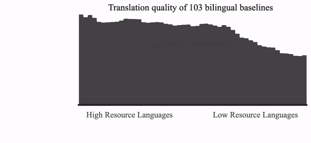 在增加数据匮乏的语种数量之后,数据丰富的语种翻译质量开始下降。这种下降在多任务设置中可以被观察到,由任务间的竞争和迁移的单向性引起(即从数据丰富的语言到数据匮乏的语言)。研究人员探索了能够更好地学习和实现能力控制的算法,以此来解决这种负迁移问题。在此过程中,他们还通过增加神经网络模型的参数量来提高其表征能力,以此来提高数据丰富语言的翻译质量。