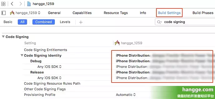 (3)在“Build Settings” -> “ Code Signing ”区域中选择发布证书。