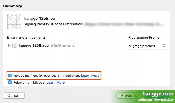 (10)接下来是确认页面,我们可以核对下各个配置是否正确。同时勾选下方的“Include manifest for over-the-air Installation”,表示生成 .ipa 文件的同时还会生成 .plist 文件。