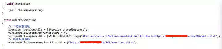 流程:启动应用访问versions.plist检测是否有新版本------有新版本则访问 itms-services://?action=download-manifest&url=xxxx.xxxx.com/IOS/xxt.pli…下载安装最新版本。