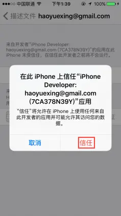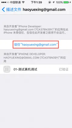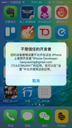 iOS企业签名:不受信任的开发者 iOS开发 2019-10-13 814 阅读1分钟 运行的时候这里可能会再手机上出现一个“不受信任的开发者”的提示。“设置” – “通用” – “描述文件”“开发者账号”“信任开发者账号”“信任”最后就能跑起来啦!!!
