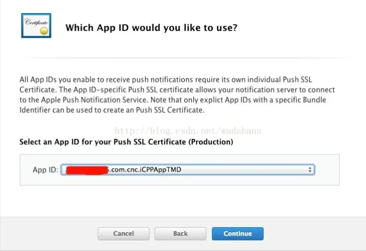 2. 创建一个Certificates,勾选Apple Push Notification service SSL, 然后选择刚才创建的APP IDs (com.cnc.iCPAppTMD)