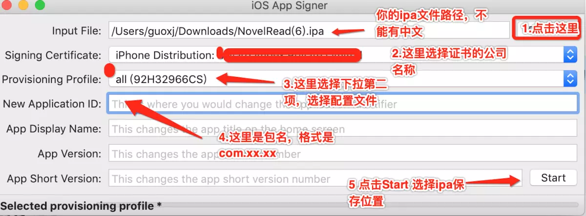企业签名的证书一般是两部分,1、XXX.p12文件,这是证书文件,点击后,输入导入密码以后,证书会被添加到钥匙串。2、XXX.mobileprovision文件,这是配置文件,用在下面工具里面的第三项,Provision Profile,点击下拉菜单,选择Choose Custom File,选择这个文件即可。打开工具,