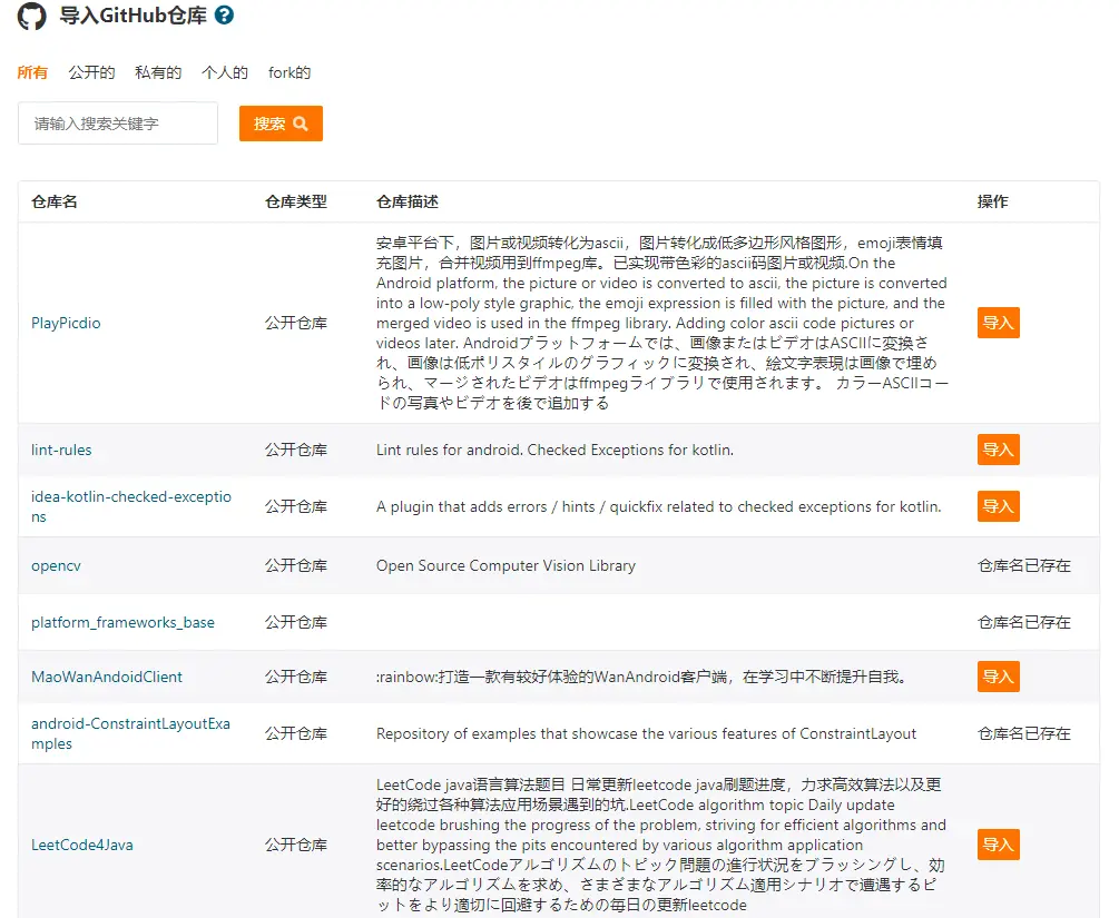 点击从github导入以后,接下来会出现你在github仓库上属于你或者你fork的代码: