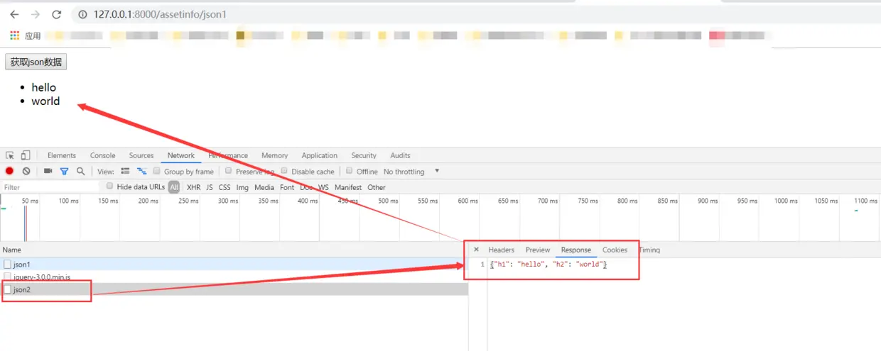 好了,到这里就可以点击json1页面中的按钮,通过ajax获取json2的json返回数据了。 如下:
