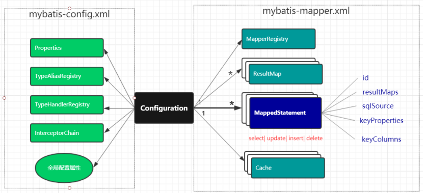 配置文件的解析流程即是将上述XML描述元素转换成对应的JAVA对象过程,其最终转换对象及其关系如图所示: