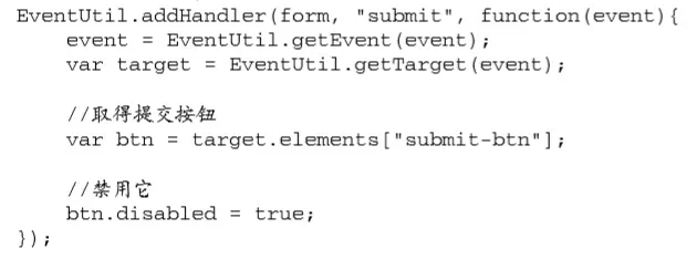 解决重复点击表单的提交按钮:常见的解决方案,就是在第一次单击后就禁用提交按钮。只要侦听 submit 事件,并在该事件发生时禁用提交按钮