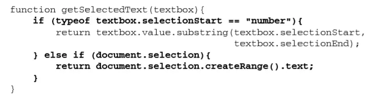 要选择文本框中的部分文本,必须 首先使用 IE 在所有文本框上提供的 createTextRange()方法创建一个范围,并将其放在恰当的位置 上。然后,再使用 moveStart()和 moveEnd()这两个范围方法将范围移动到位。不过,在调用这两个 方法以前,还必须使用 collapse()将范围折叠到文本框的开始位置。此时,moveStart()将范围的起 点和终点移动到了相同的位置,只要再给 moveEnd()传入要选择的字符总数即可。后一步,就是使 用范围的 select()方法选择文本