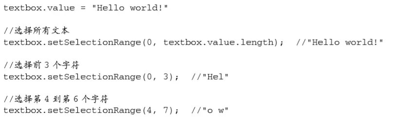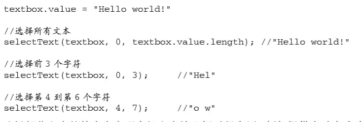 selectText()函数接收三个参数:要操作的文本框、要选择文本中第一个字符的索引和要选 择文本中后一个字符之后的索引