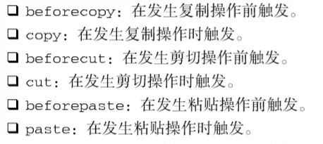 在 Safari、Chrome和 Firefox 中,beforecopy、beforecut 和 beforepaste 事件只会在显示针对文本框的上下文菜单(预期将发 生剪贴板事件)的情况下触发。但是,IE则会在触发 copy、cut 和 paste 事件之前先行触发这些事件。 至于 copy、cut 和 paste 事件,只要是在上下文菜单中选择了相应选项,或者使用了相应的键盘组合 键,所有浏览器都会触发它们