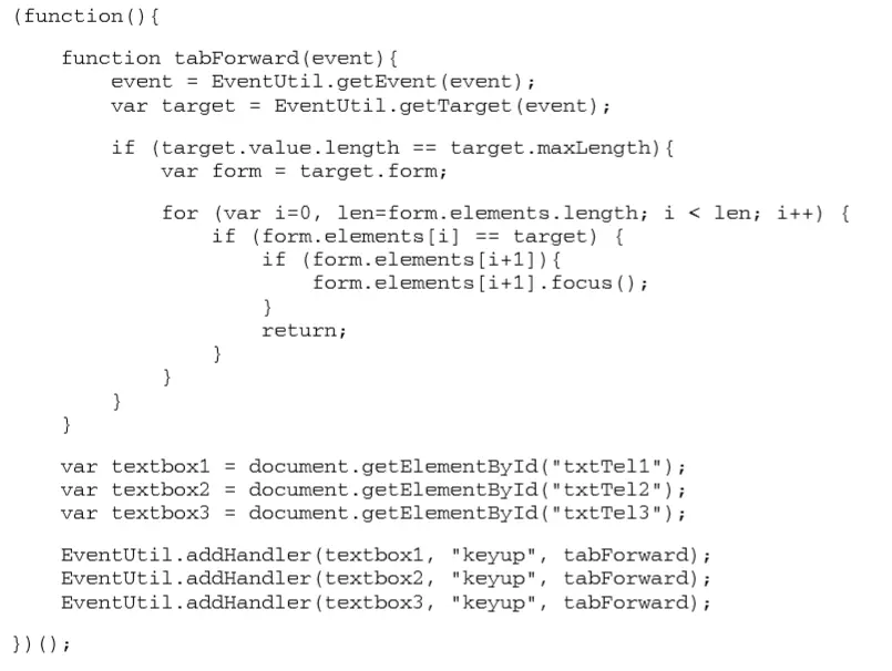 tabForward()通过比较用户输入的值与文本框的 maxlength 特性,可以确定是否已经达到大长度。如果这两个值相等(因为浏览器终 会强制它们相等,因此用户绝不会多输入字符),则需要查找表单字段集合,直至找到下一个文本框
