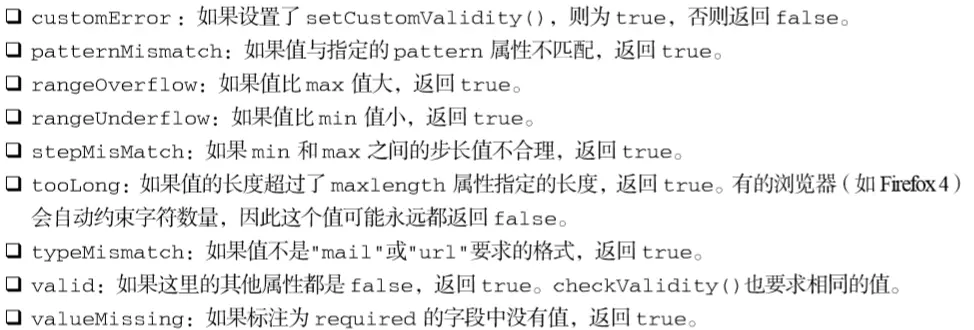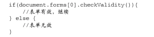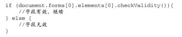 使用 checkValidity()方法可以检测表单中的某个字段是否有效,若字段的值有效,这个方法返回 true,否则返回 false