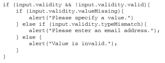 要检测整个表单是否有效,可以在表单自身调用 checkValidity()方法。如果所有表单字段都有 效,这个方法返回 true;即使有一个字段无效,这个方法也会返回 false
