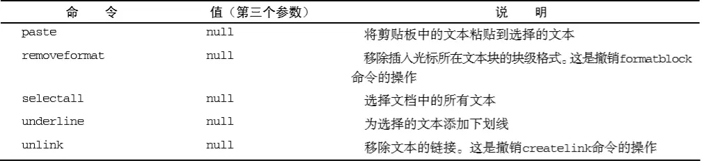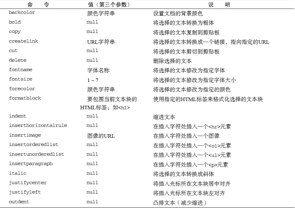 为 document.execCommand()方法传递 3个参数: 要执行的命令名称、表示浏览器是否应该为当前命令提供用户界面的一个布尔值和执行命令必须的一个值(如果不需要值,则传递 null)
