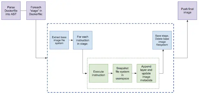 而 Kaniko 工作原理和此类似,也是按顺序执行每条命令,每条命令执行完毕后为文件系统做快照(snapshot)。并与上一个快照进行对比,如果发现任何不一致,变回创建一个新的层级,并将任何修改都写入镜像的元数据中。