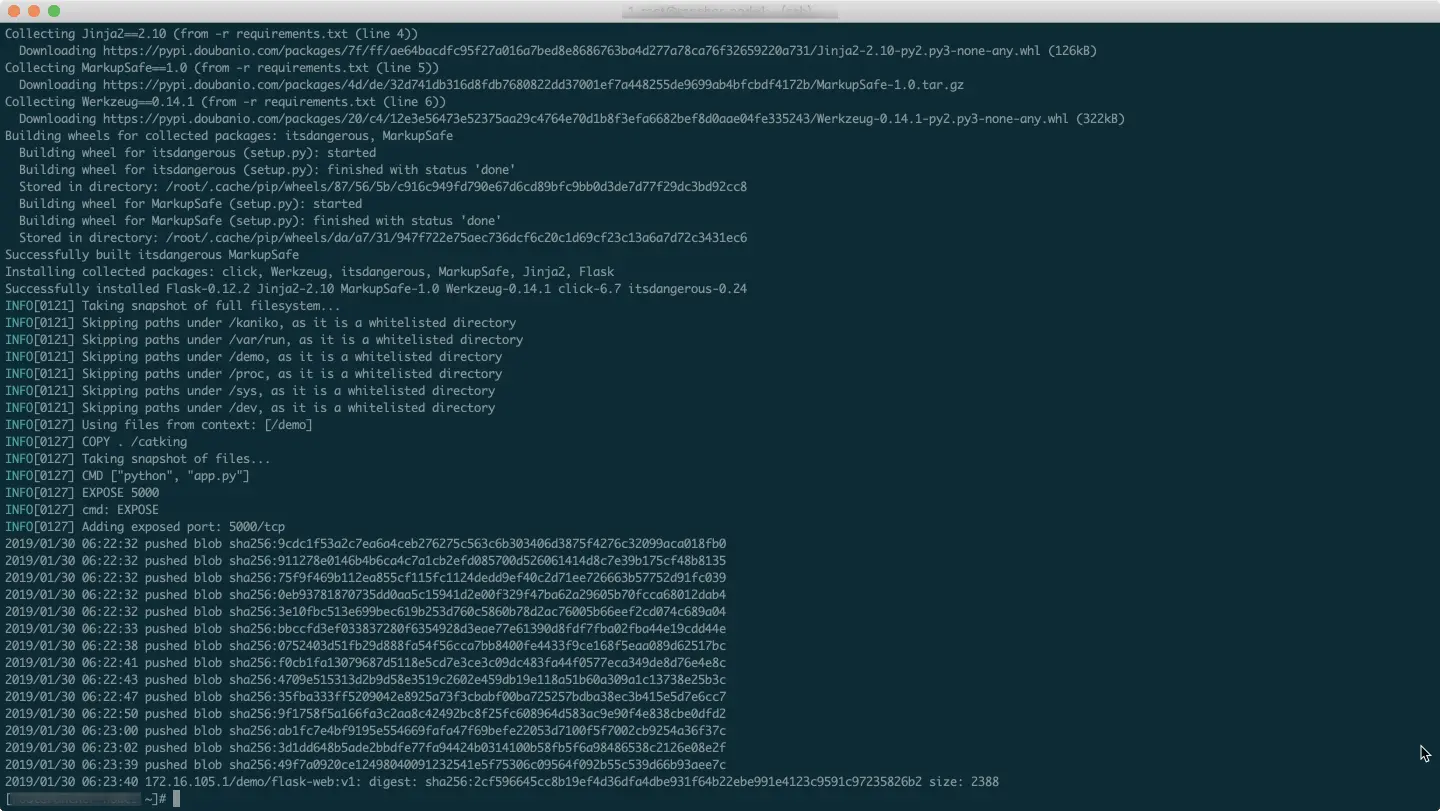 当 Dockerfile 中每条命令都执行完毕后,Kaniko将新生成的镜像 push 到指定的 registry。
