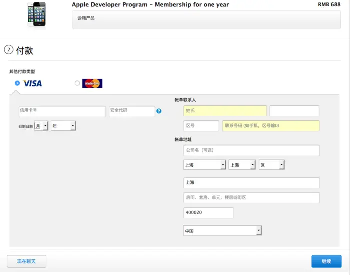 然后填入个人名字、电话、地址(中英文两遍)然后继续
