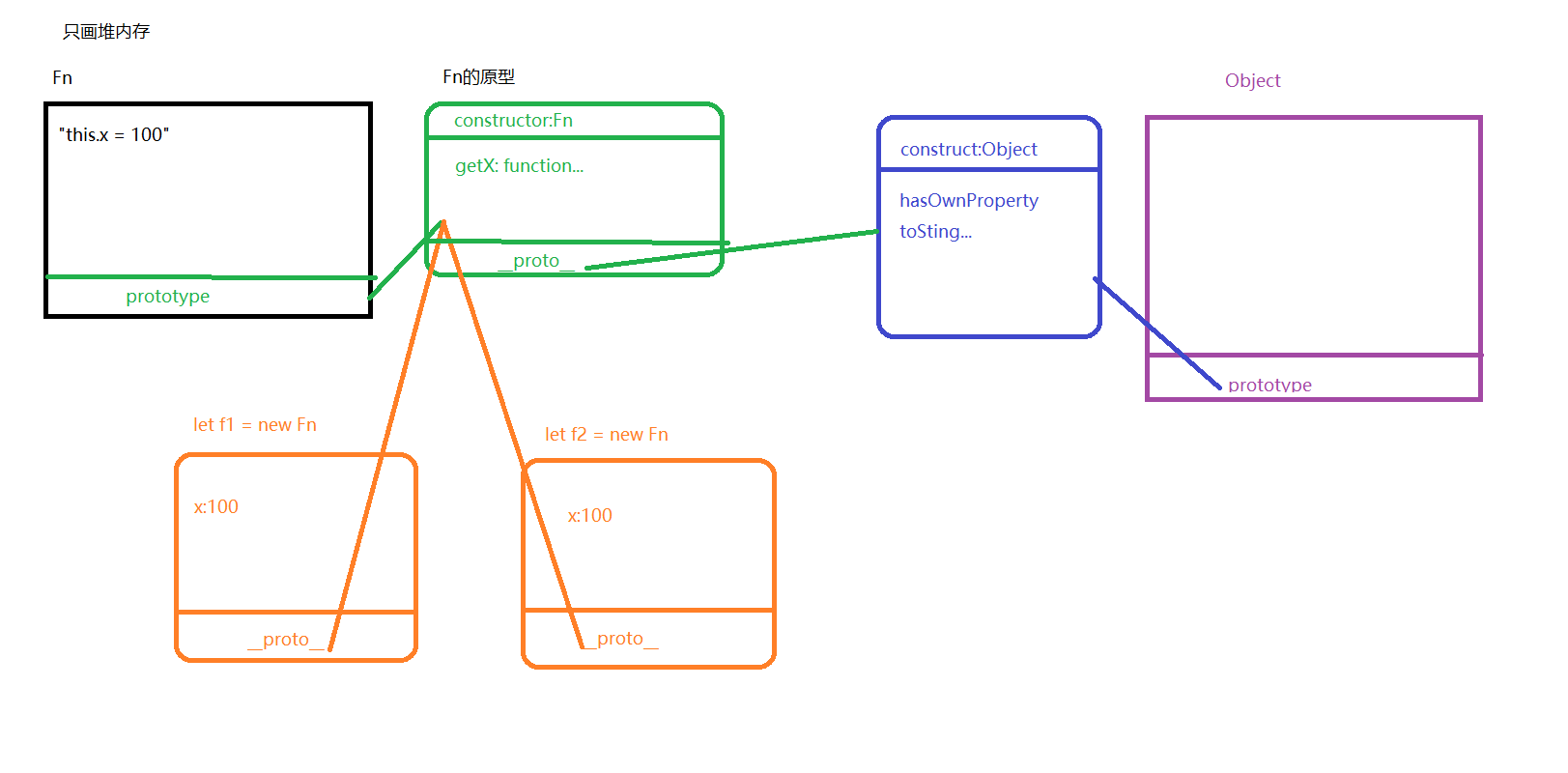 // 6、f1和f2都是Fn这个类的一个实例,都拥有x和getX两个属性,当时这两个属性是各自的私有的属性,所以: