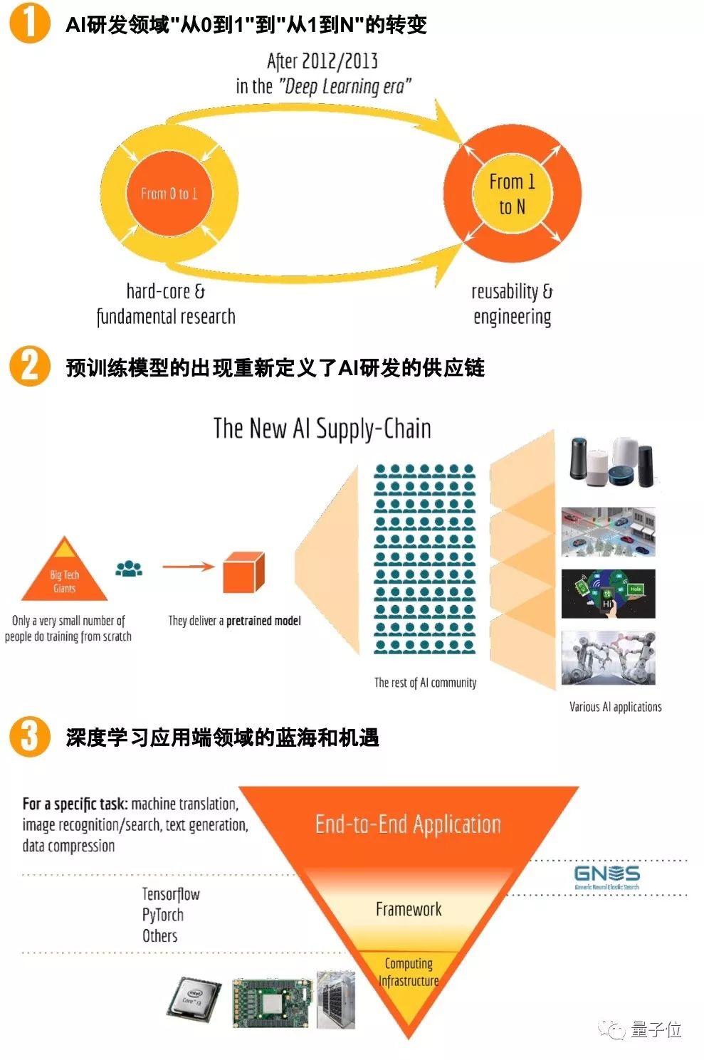 而”从0到1”的硬核创新圈会变得非常小众。 - 预训练模型的出现重新定义了AI研发的供应链。传统的机器学习下那种一两个团队全栈负责AI训练部署分发等以整条供应链的情景将会越来越少。