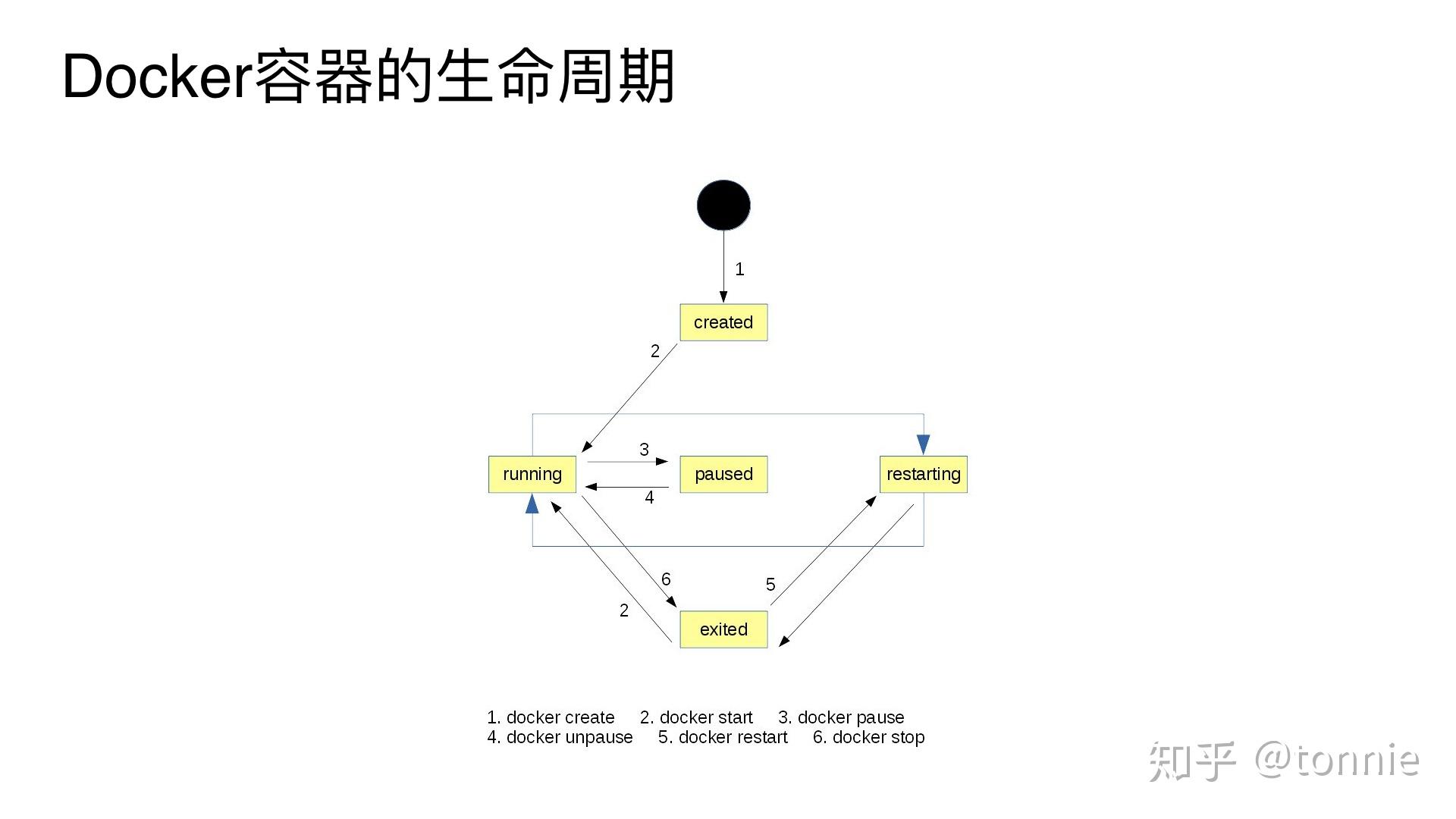 容器在创建时进入Created状态,运行后进入Running状态,接着会进入到Pause状态或Exited状态,对已经退出的容器执行重启操作会使容器进入Restarting状态,随后转为Running状态。