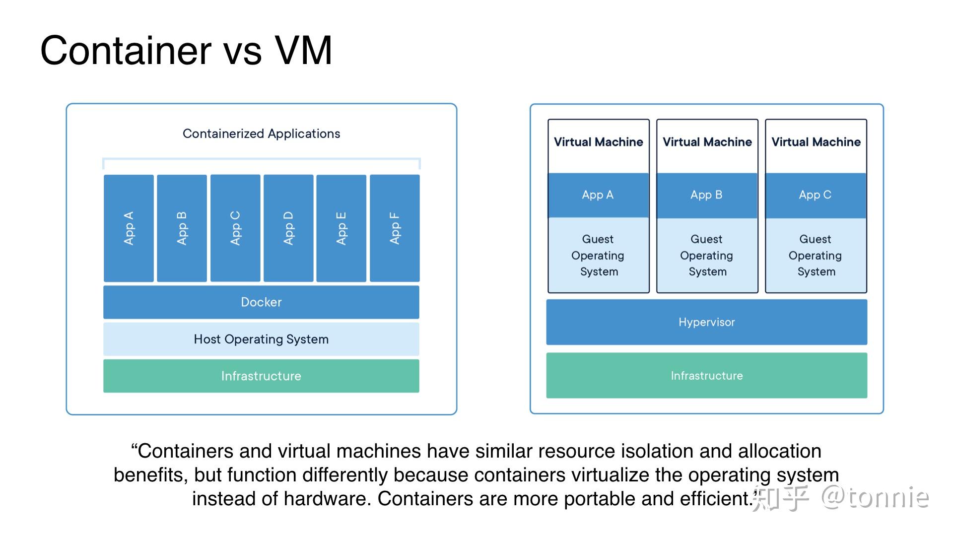 人们经常用虚拟机和容器来做比较,那么它们两之间有什么区别呢?其实它们最核心的区别在于虚拟化资源的层面不一样,虚拟机是在硬件层之上实现虚拟化的,而容器则直接在操作系统之上实现虚拟化,从图中可以看出,每个虚拟机都需要在一个Guest OS之上,而容器则可以都处在同一个宿主机之上。